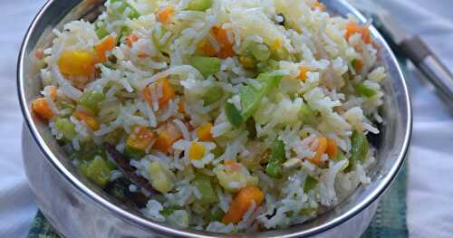 Vegetable pulao is a one-pot rice dish prepared by cooking rice with mixed vegetables and spices.
