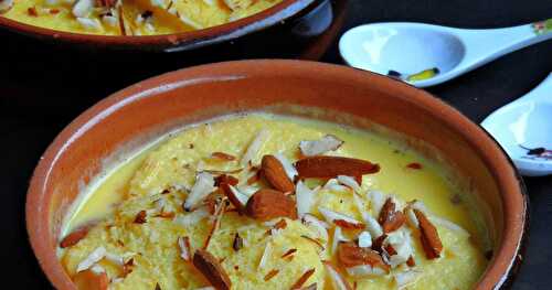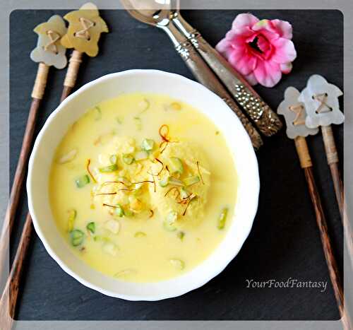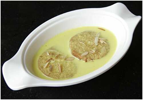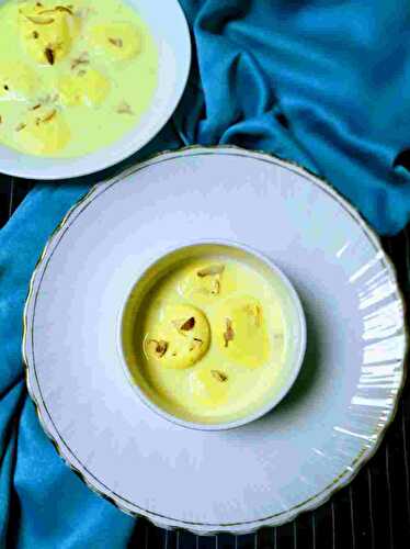 Soft and sweet flattened rasgulla are dipped in a creamy condensed milk flavored with saffrons cardamom and garnished with nuts.