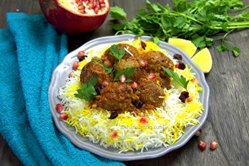 Succulent and melt-in-the-mouth Persian-style meatballs nested on vibrant, fragrant, and aromatic saffron rice.