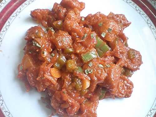 Chilli Soya Chunks is an Indo-Chinese starter dish in which Soya chunk nuggets are cooked with Onions, Bell peppers and Sauces.