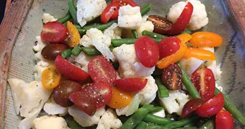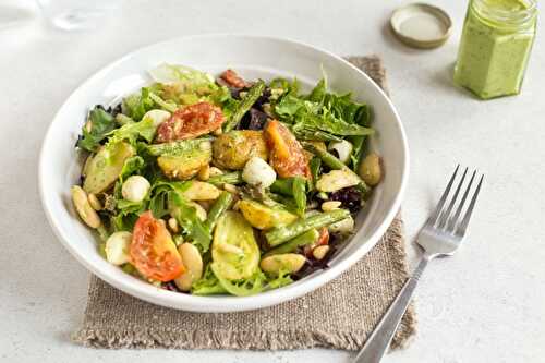 A luxurious summer salad with roasted potatoes, two different kinds of beans, roasted tomatoes, mozzarella pearls, and a super creamy homemade pesto dressing.