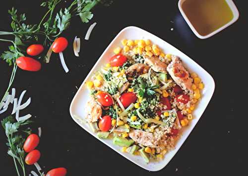 A crunchy grilled chicken salad that is powered with quinoa, and flavored with cilantro pesto.