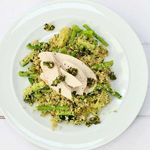 This vibrant quinoa, pesto and chicken salad with green vegetables makes a tasty light meal.