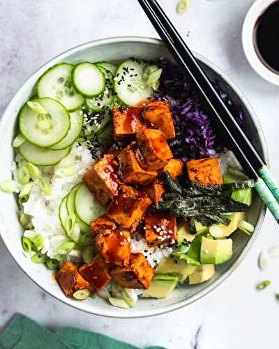This sticky tofu poke bowl is sweet & spicy with some cool, crunchy vegetables topped on a bed of vinegared sushi rice.