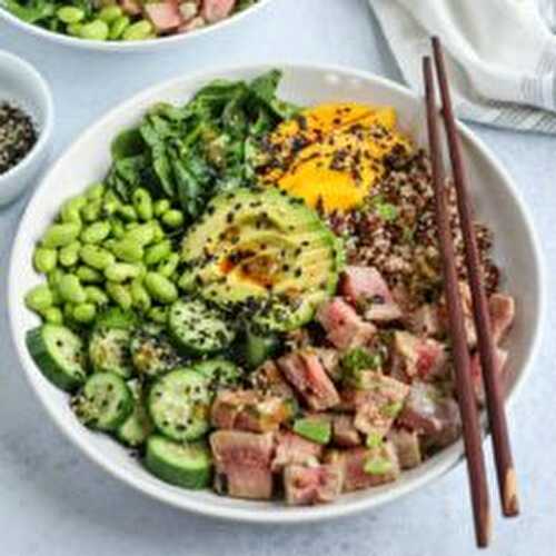 Ahi Tuna Poke Bowl: Rich, tender shush-grade raw tuna is cut into cubes and lightly marinated.