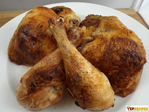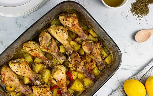 This is the ULTIMATE roast chicken dinner! Chicken pieces are baked until golden and crispy in a vibrant lemon marinade that does double duty as a sauce.