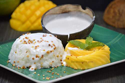 Thai Style Mango Sticky Rice is a traditional Thai dessert where steamed glutinous rice is served with sweet coconut milk sauce and fresh mangoes.