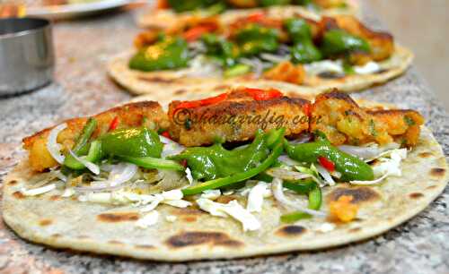 Tandoori flavored chicken pieces wrapped in whole wheat bread with crunchy vegetable salad and mint chutney.