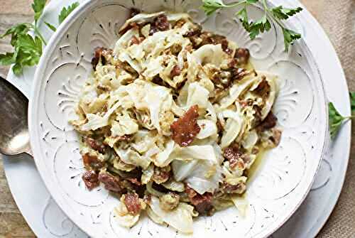 Adapted from The Nourished CavemanRoasted cabbage "noodles" smothered in creamy carbonara sauce, topped off with crunchy bits of bacon.