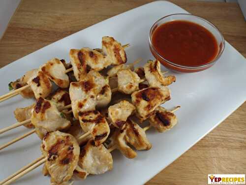Asian inspired marinated chicken skewers with a spicy Kimchi pineapple and honey dipping sauce.