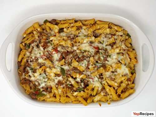 Campanelle pasta, tomato, onion, bell pepper, and homemade sausage layered with mozzarella cheese and baked.