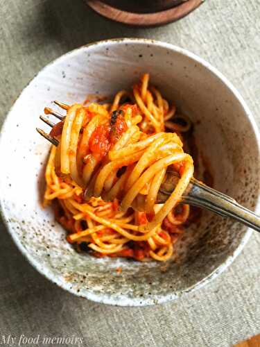 Linguini alla puttanesca is an Italian easy and surprising recipe based on some kitchen leftovers: anchovies, capers, olives and tomatoes.