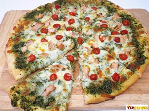 Basil and kale pesto sauce topped with chicken and grape tomatoes make for a scrumptious slice of pizza