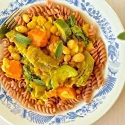 Healthy, gluten-free, vegan Parsi Wedding Stew of sweet potato, carrot, green peas, bell peppers, flavored with cider vinegar, sugar, Worcestershire sauce.