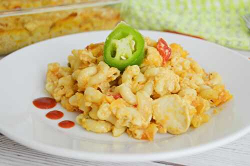 This homemade mac and cheese recipe is cooked with a spicy chicken mixture and a creamy béchamel sauce.