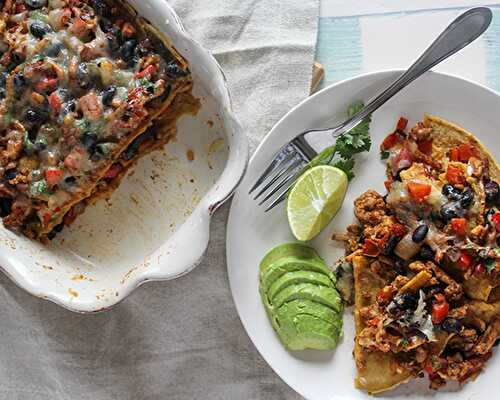 Spicy ground chicken casserole with black beans is made with lean ground chicken, peppers, black beans in a spicy fresh tomato sauce,