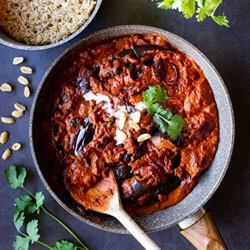 If you love nutty flavours and creamy vegan curries then this stuffed aubergine curry will definitely make you happy! With a spiced peanut and tamarind filling you won't be able to stop eating these baby aubergines!