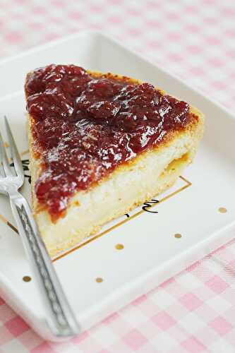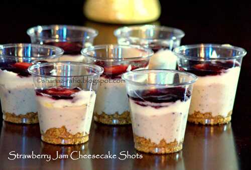 A shot glass dessert served individually with a base of biscuit and topped with layers of cheesecake and strawberry jam.