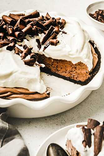 Delicious no-bake chocolate mousse pie with oreo cookie crust, chocolate mousse, whipped cream and chocolate curls (for a 9 inch / 23-25 cm diameter pie dish, about 12 servings