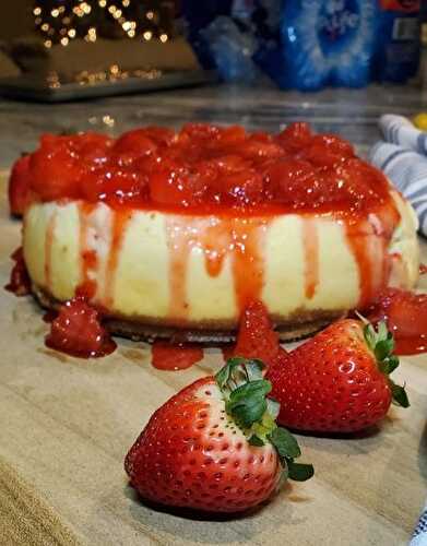 This creamy cheesecake has a secret ingredient that takes it over the top! The homemade strawberry sauce will bring this cheesecake to the next level and everyone you serve it to will beg for the recipe!