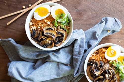 The coconut curry sauce of your Thai takeout food dreams, all aswirl with ramen noodles, topped off with crispy mushrooms and an oozy, soft-boiled egg.