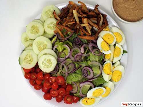 A Southern Thai salad with Indian influences made with romaine lettuce, boiled egg, cucumber, tomatoes, red onion, and crisp potato sticks served with a peanut dressing.