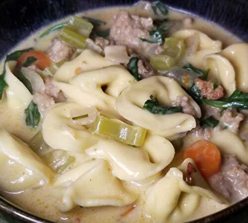 A creamy, comforting soup with italian sausage, cheese tortellini, and spinach.