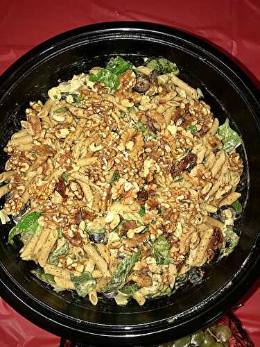 Rotini pasta, artichoke hearts, three kinds of olives, marinated roasted red peppers, pepperoncini or banana peppers, pecorino romano and parano cheese, salami or summer sausage and turkey pepperoni all tossed in Italian vinaigrette makes a delicious.