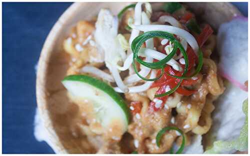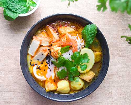 I was craving for a bowl of curry laksa but my fridge almost empty so I made this rice noodles soup with anything left.