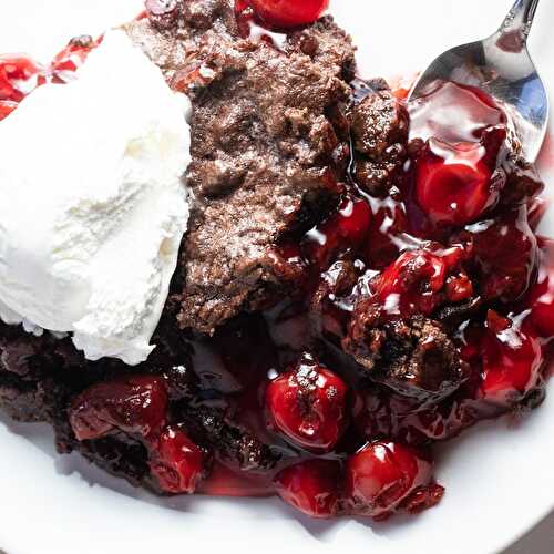Tasty cherry chocolate dump cake combines sweet and tangy cherry pie filling with chocolate cake mix for a fudge brownie-like topping! It's a classic combination of chocolate and cherry that is sure to be a new family favorite dessert!