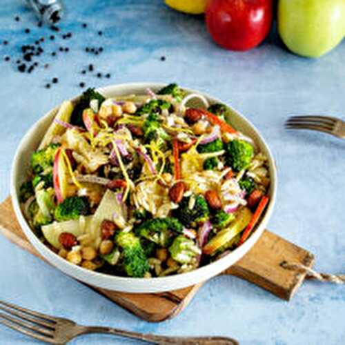 Vegan Orzo Salad with roasted broccoli, apple, chickpeas, toasted almonds, and a zesty garlic-cashew dressing.