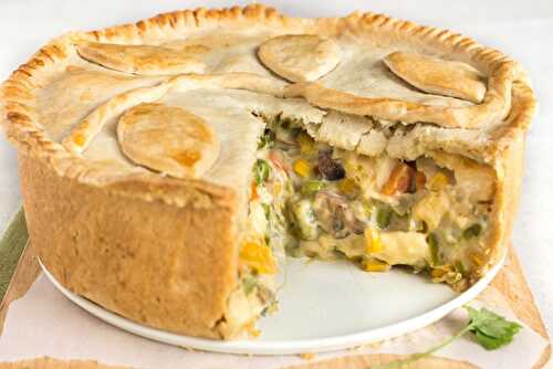 Creamy vegetable and halloumi pie - crispy pastry with colourful veggies, creamy sauce, and soft and squidgy halloumi cheese.