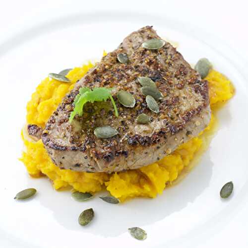 Ponzu Steak on a Wasabi pumpkin purée is an almost asian dish, the underlying flavours are all japanese although the format of the dish is more western cuisine (steak, potato).