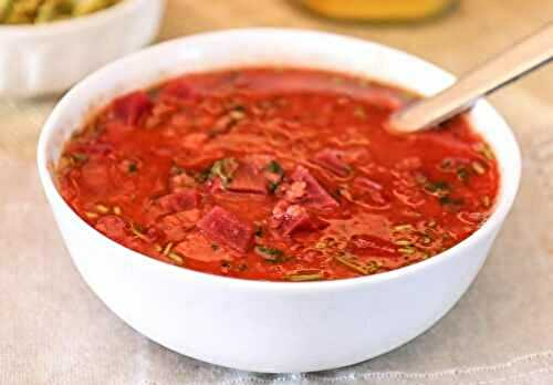 This smooth beet soup is eye-catching because of its impressive bright red color, and it's a wonderful soup to serve at a dinner party.