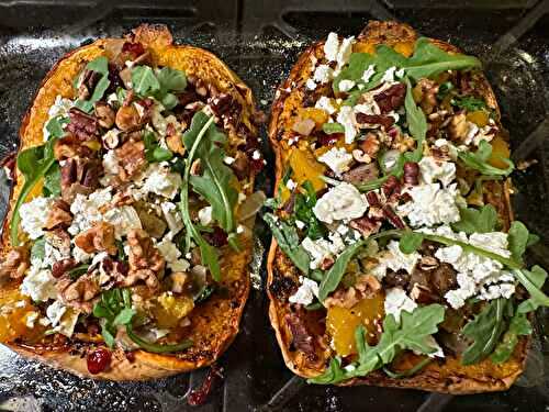 Roasted Butternut Squash, filled with a stuffing of the squash, sautéed onions, dried cranberries, pecans, walnuts, arugula and feta cheese.