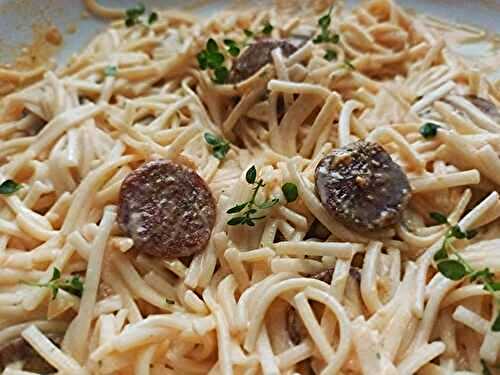 Easy prawn and chorizo pasta recipe with fresh linguine pasta, prawns, chorizo, and seasoning.