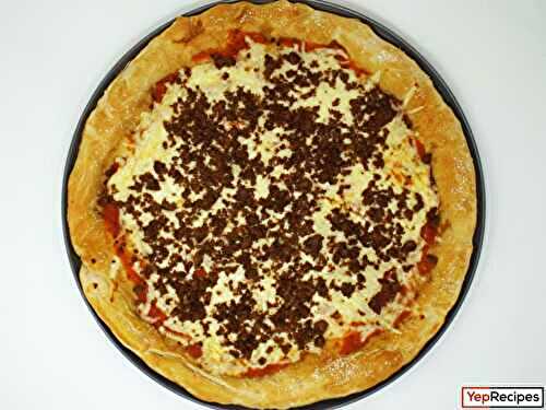 A homemade pretzel pizza crust topped with a homemade pizza sauce, homemade chorizo sausage, and mozzarella cheese.