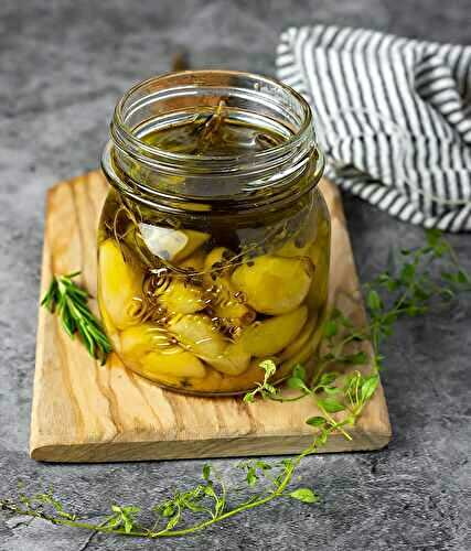 Garlic Confit is easy to prepare, garlic cloves are topped with olive oil, oregano, and thyme, slowly baked.