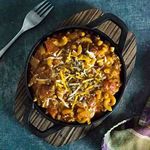 This slow cooker goulash is a flavorful and delicious meal that is packed with macaroni noodles, ground beef, and seasonings.