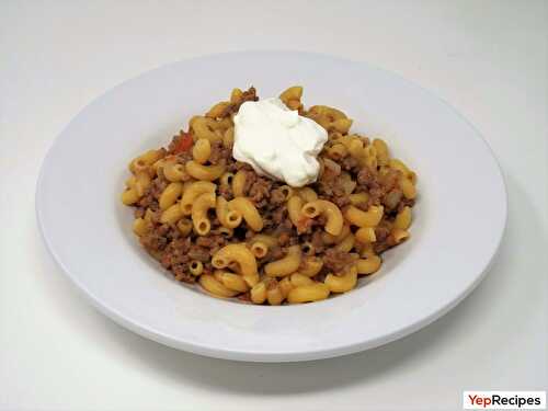 Seasoned ground beef and pork cooked with onion, garlic, and tomatoes then mixed with macaroni pasta and topped with sour cream.
