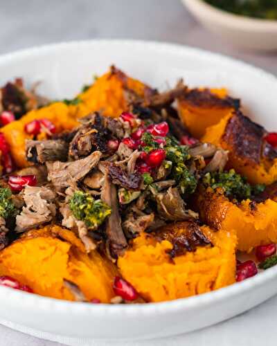 The best way to use up leftover lamb— paired with caramelised squash, homemade mint gremolata, and sprinkled with juicy pomegranate seeds.