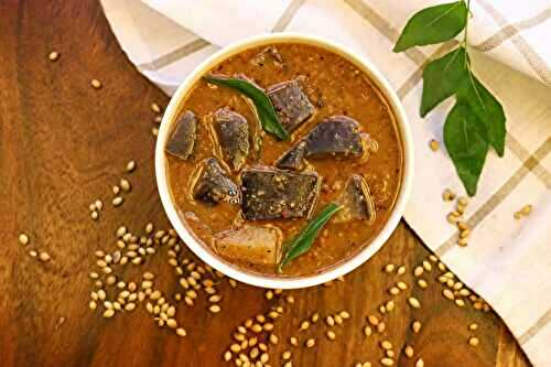This South Indian comfort food combines tender brinjals with tangy tamarind and aromatic spices.