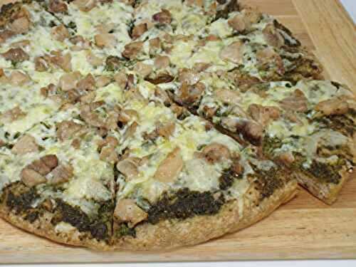 A hearty homemade pizza crust slathered with a homemade pesto sauce then topped with chicken and mozzarella cheese.