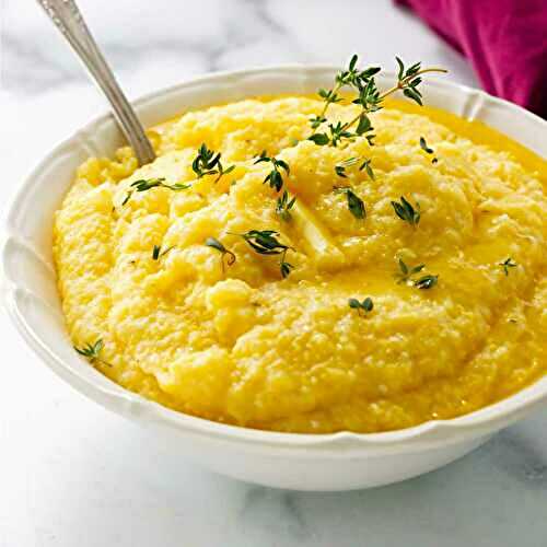 A simple rich and creamy polenta made with yellow cornmeal, whole milk, butter, salt, and pepper.