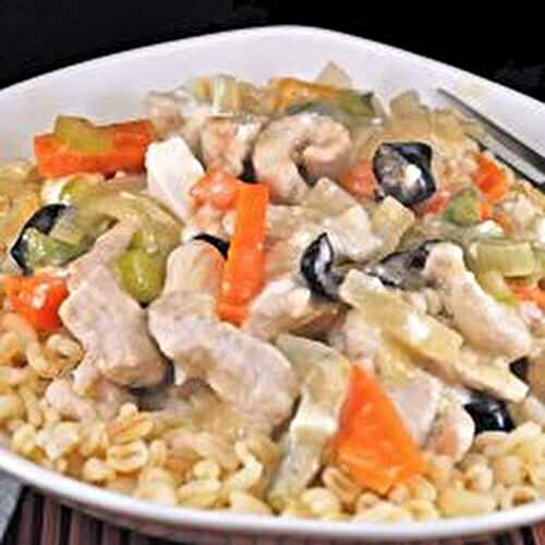 Stir-fry with a Greek flavor: Chicken with Chickpeas and Preserved Lemon, on Orzo with feta and Greek olives