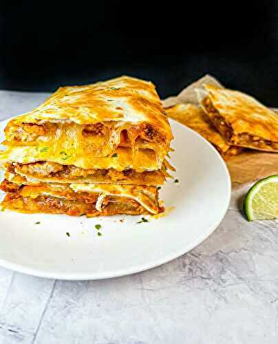This easy chicken and cheese quesadilla recipe featuring diced jalapenos and red onion is perfectly gooey and delicious.