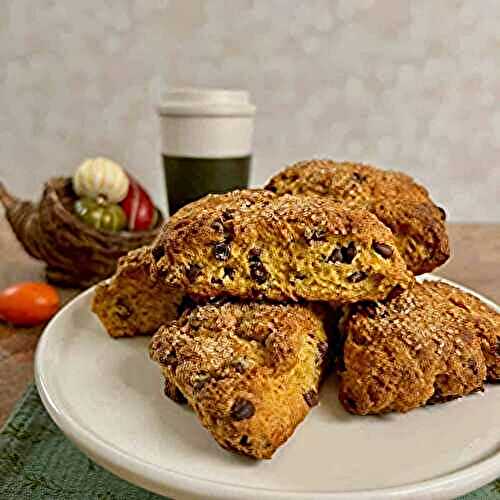 Pumpkin purée, mini chocolate chips, and a warm pumpkin spice blend team up to make these deliciously easy pumpkin scones.