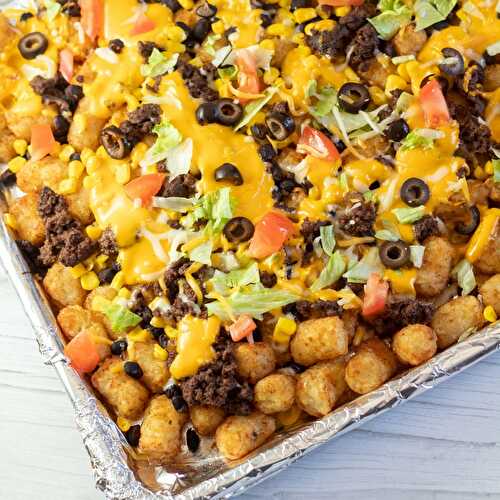 These totchos are the ultimate gameday snack that combines crispy tater tots with all of your favorite nacho toppings! Taco seasoned tater tots are topped with creamy nacho cheese sauce, ground beef, sweet corn, black beans, and shredded cheese! These.