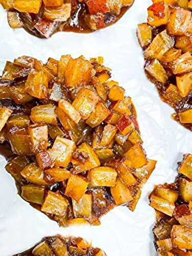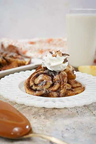 With just a five ingredients, you can enjoy cooked apples topped with cinnamon rolls, caramel, and toffee bits.
