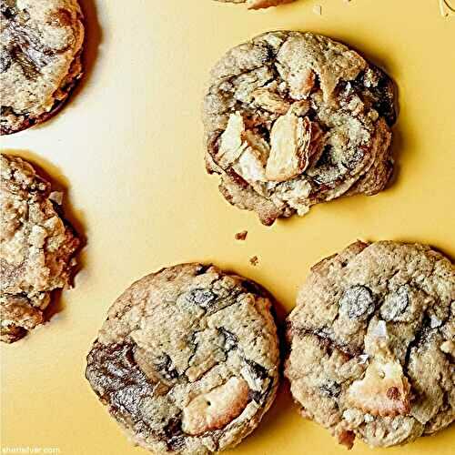 These butter crunch cookies are thick, chewy, packed with tasty toffee bits, and then sprinkled with flaky sea salt! They are so easy to make that you don't need an electric mixer, and everything is combined in just one bowl! The brown butter and toffee.